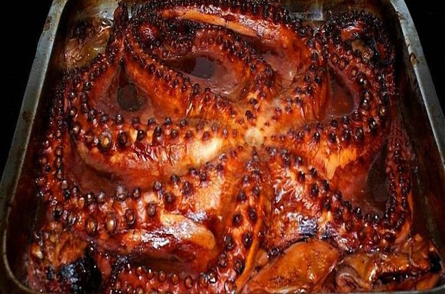 El pulpo al horno al estilo murciano es un plato exquisito, cuyos ingredientes son, además del pulpo, el zumo de un par de limones, agua y sal.
